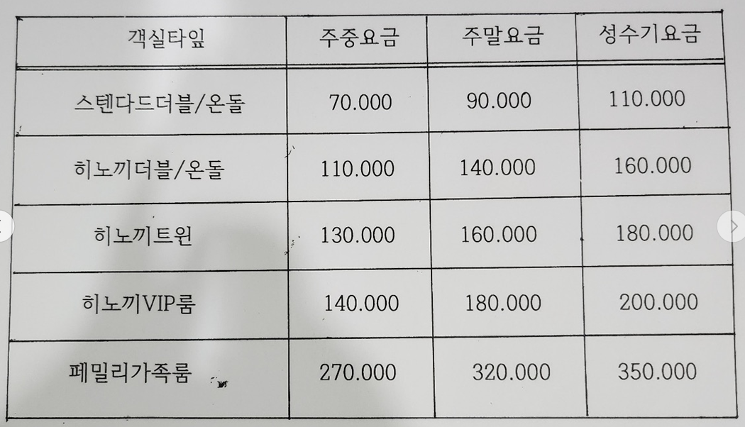 주중/주말/성수기로 나누어 요금표 변경 요청드립니다.
