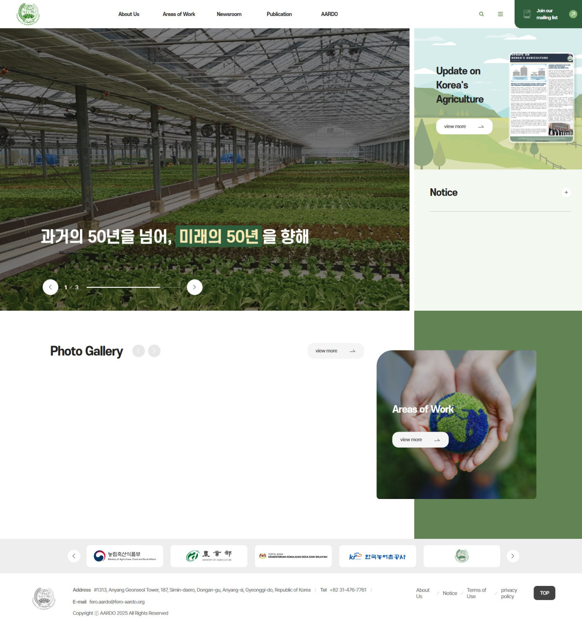 대형 메인 비주얼을 전면에 배치해 기관의 비전과 메시지를 강조하고, 농업·환경 이미지를 활용한 차분한 그린 컬러 톤으로 공공성과 신뢰감을 전달하는 디자인입니다. 좌우 분할 레이아웃과 여백 중심의 구성으로 콘텐츠를 명확히 구분했으며, 슬라이드·카드형 섹션을 통해 주요 사업 분야와 소식을 직관적으로 탐색할 수 있도록 설계된 것이 특징입니다.