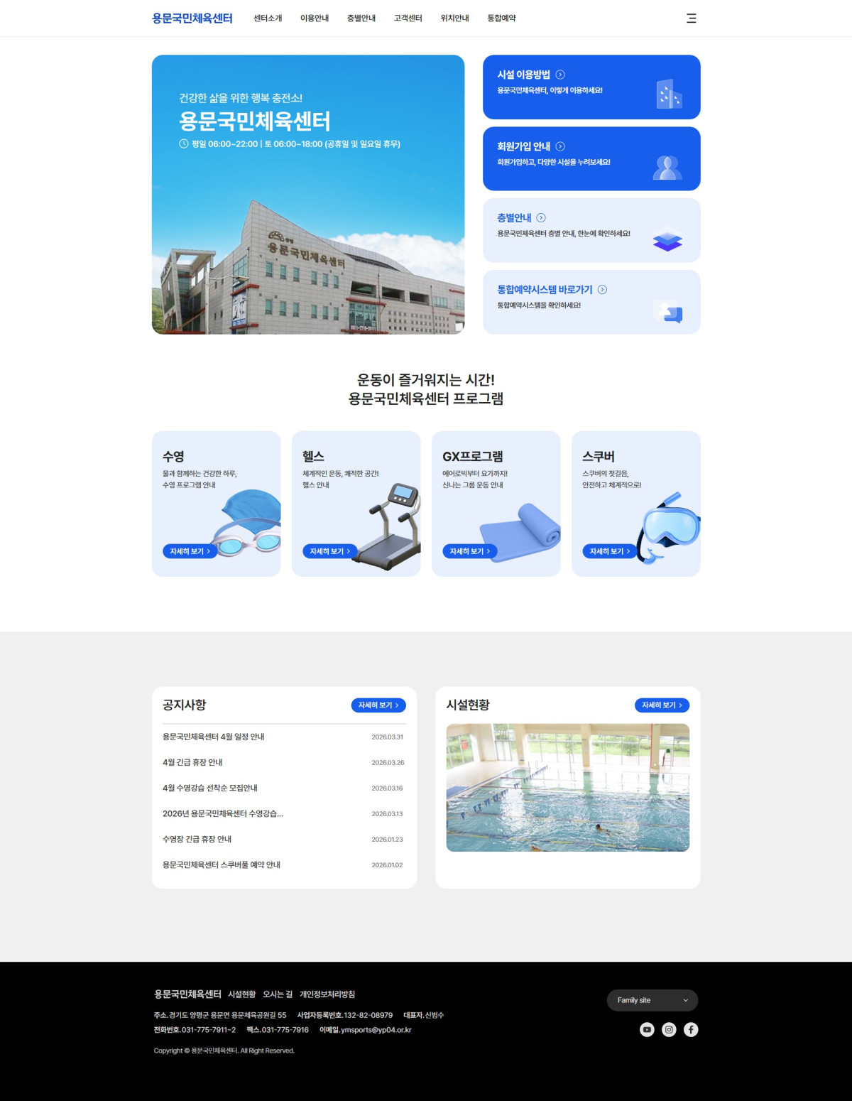 공공 체육시설의 특성을 반영하여 신뢰성과 접근성을 중심으로 구성하였습니다.